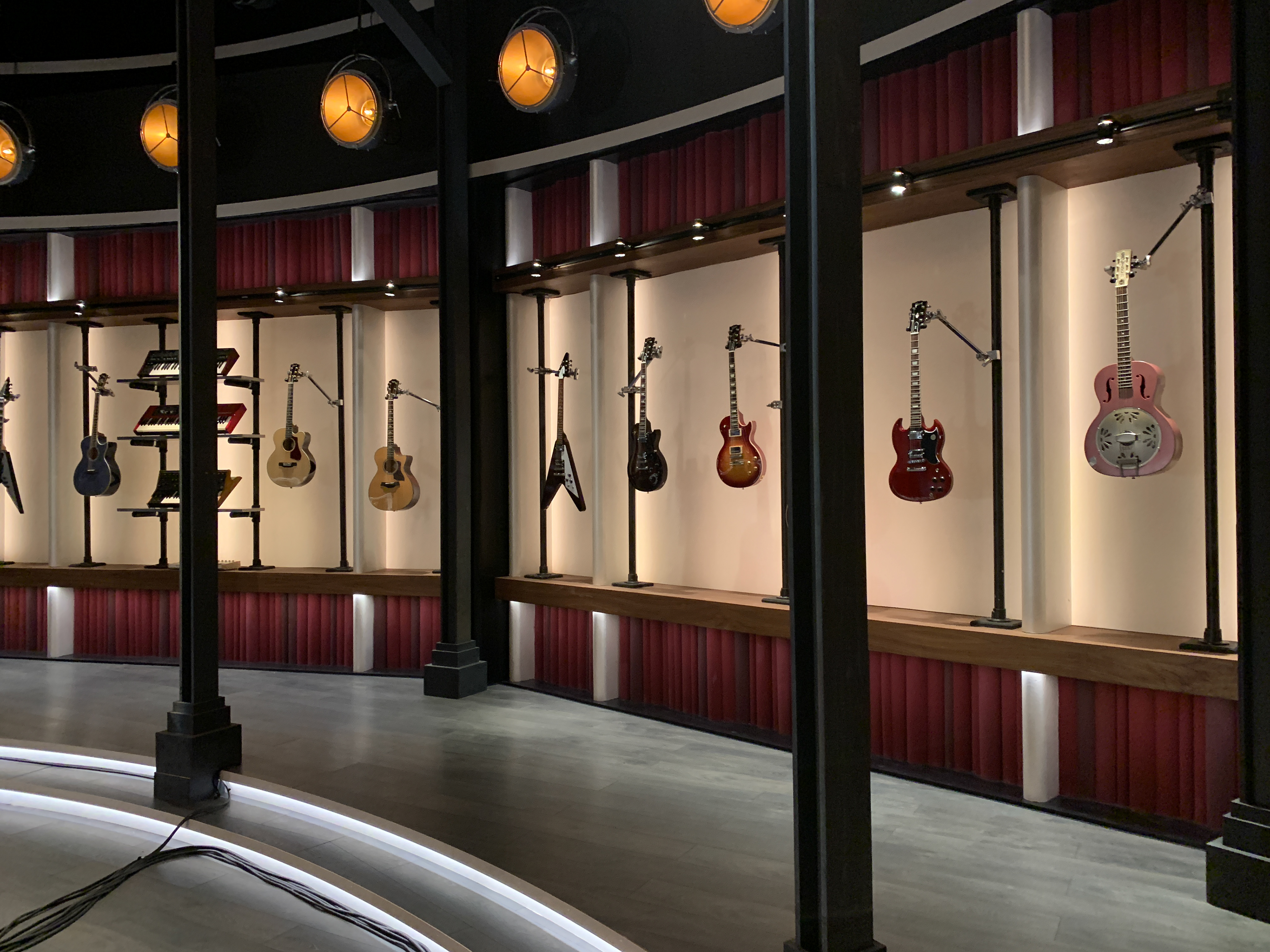 What began as a simple design concept evolved into an innovative lighting feature located opposite the slat wall. Behind each muslin-draped tube hanging guitars, FlexLED 60 White 24V 3000K was specified inside our ALM-2027 Aluminum Channel.