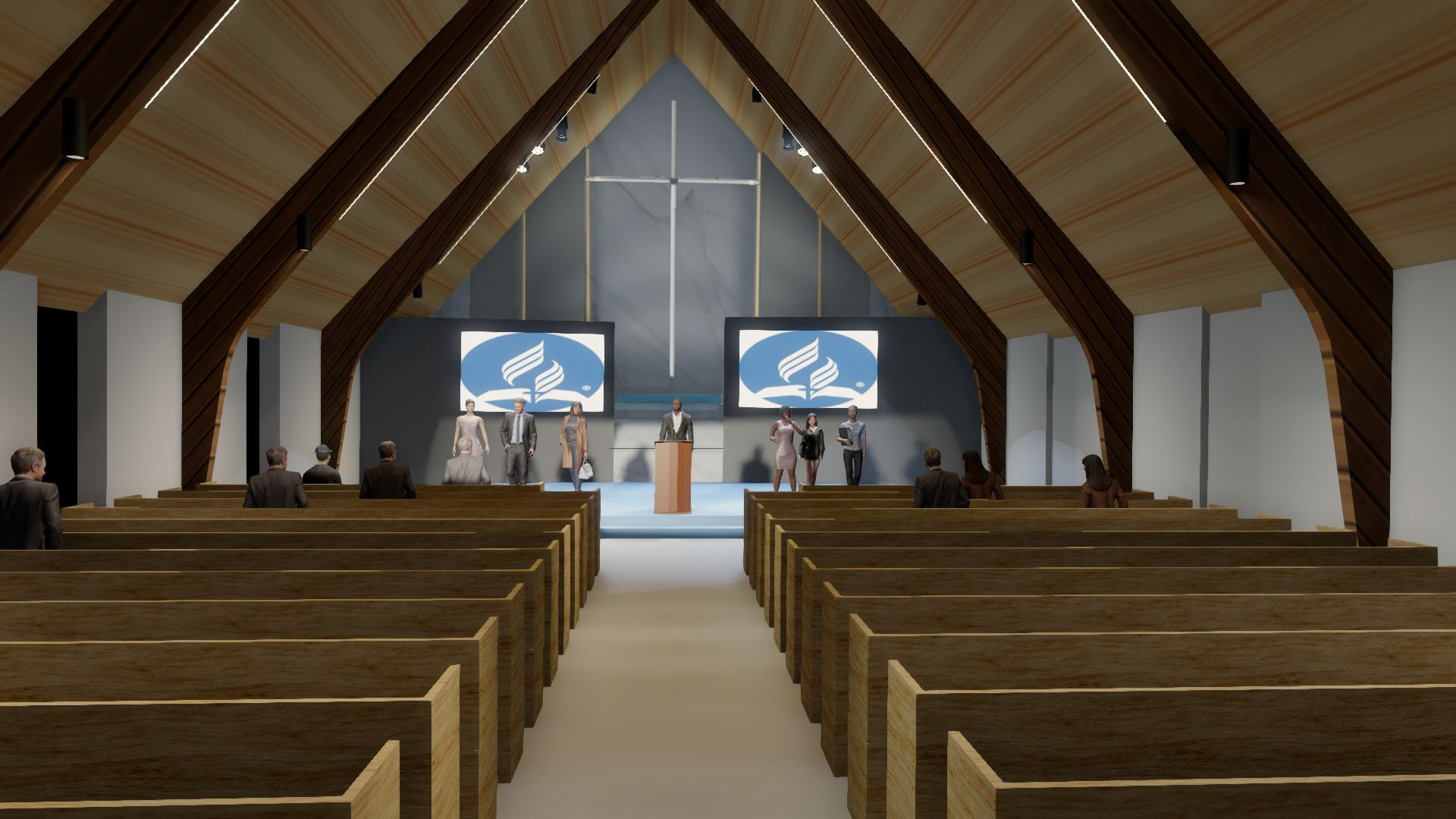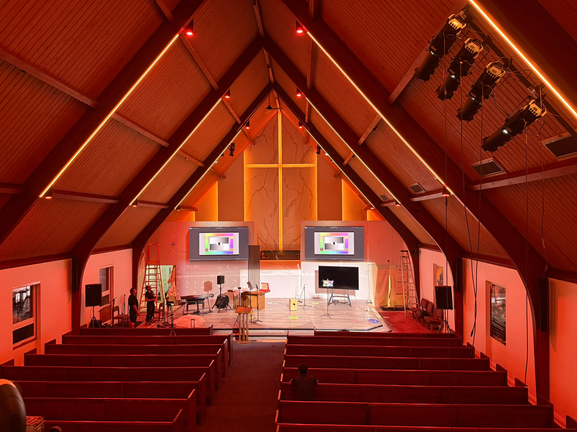 Designed by sparkAV in collaboration with Brad Dickson, Moss LED FlexLED 252 RGBA+WW+CW was integrated along the exposed overhead beams inside of our ALM-2310 channel. The same LED was incorporated across the rear wall, creating a cohesive architectural lighting feature that emphasizes the volume of the space. Controlled via Cinque-LED DMX Dimmers, the system allows seamless shifts in colour temperature and tone to suit services, performances, and special events, adding depth and visual interest to the platform backdrop worship environment.